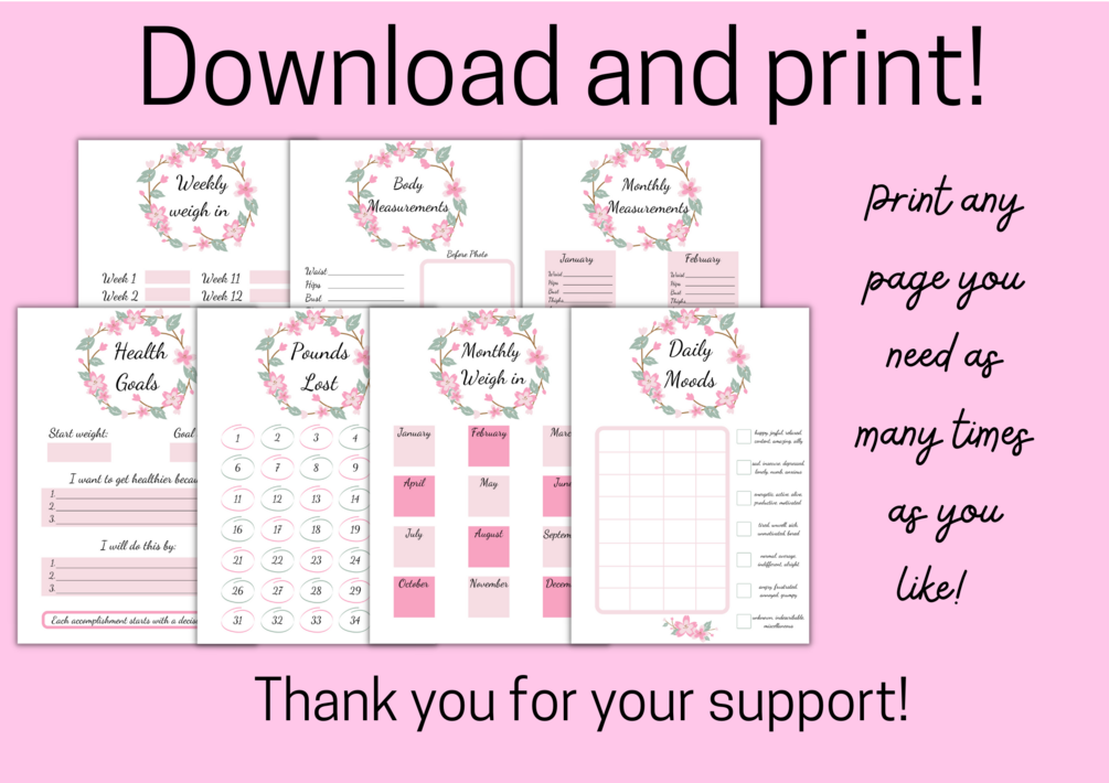This beautifully designed pink floral printable weight loss journal has everything you need to stay accountable, motivated, and achieve your weight loss goals! This printable PDF contains multiple pages for tracking weight loss, including blank pages for you to fill in so that you can start your journey when you are ready!